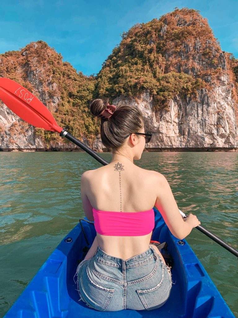 Bằng những chiếc thuyền nhỏ, du khách có thể lách qua các khe núi để du ngoạn trong các áng, vịnh nhỏ thăm hang động. Làn nước trong vắt, êm ả rất thuận lợi cho trải nghiệm kết hợp giữa thể thao – du lịch thưởng ngoạn này. Một số nơi thường được du khách lựa chọn chèo thuyền Kayak là áng Vẹm, hang Tùng Gấu, bãi Cát Dữa…